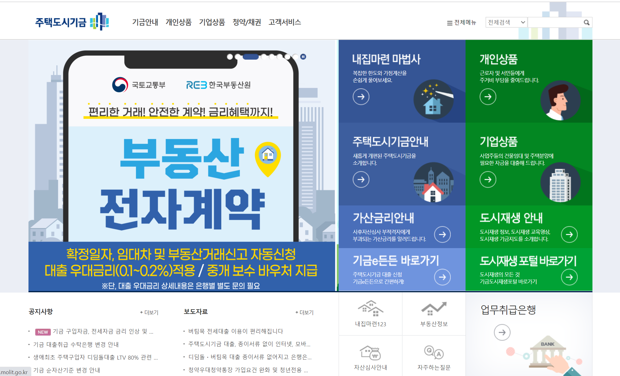 주택구입대출, 전세자금대출, 월세대출, 주택청약 등 주택과 관련한 모든 정보를 알 수 있는 사이트입니다.